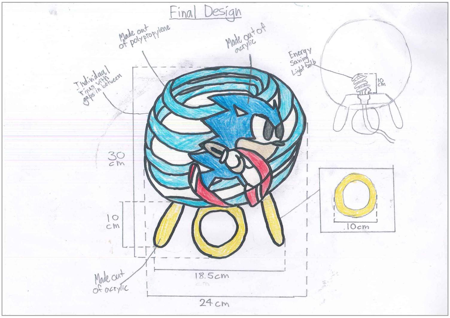 My group and I decided to go with something fun and quirky that would liven up the atmosphere of a bedroom. We split the project into four roles: designer, planner, manufacturer, and painter. I was the sole designer and came up with the concept drawings below in Figure 1. While one half of my group came up with the specifications and measurements, me and another person whom I had never really spoken to then turned my concept drawing into a CorelDRAW drawing, which we used to laser cut the necessary parts for the lamp. My teammate also was a fan of this video game character, and working together to design the lamp was a really great way to begin talking, and today we remain great friends.